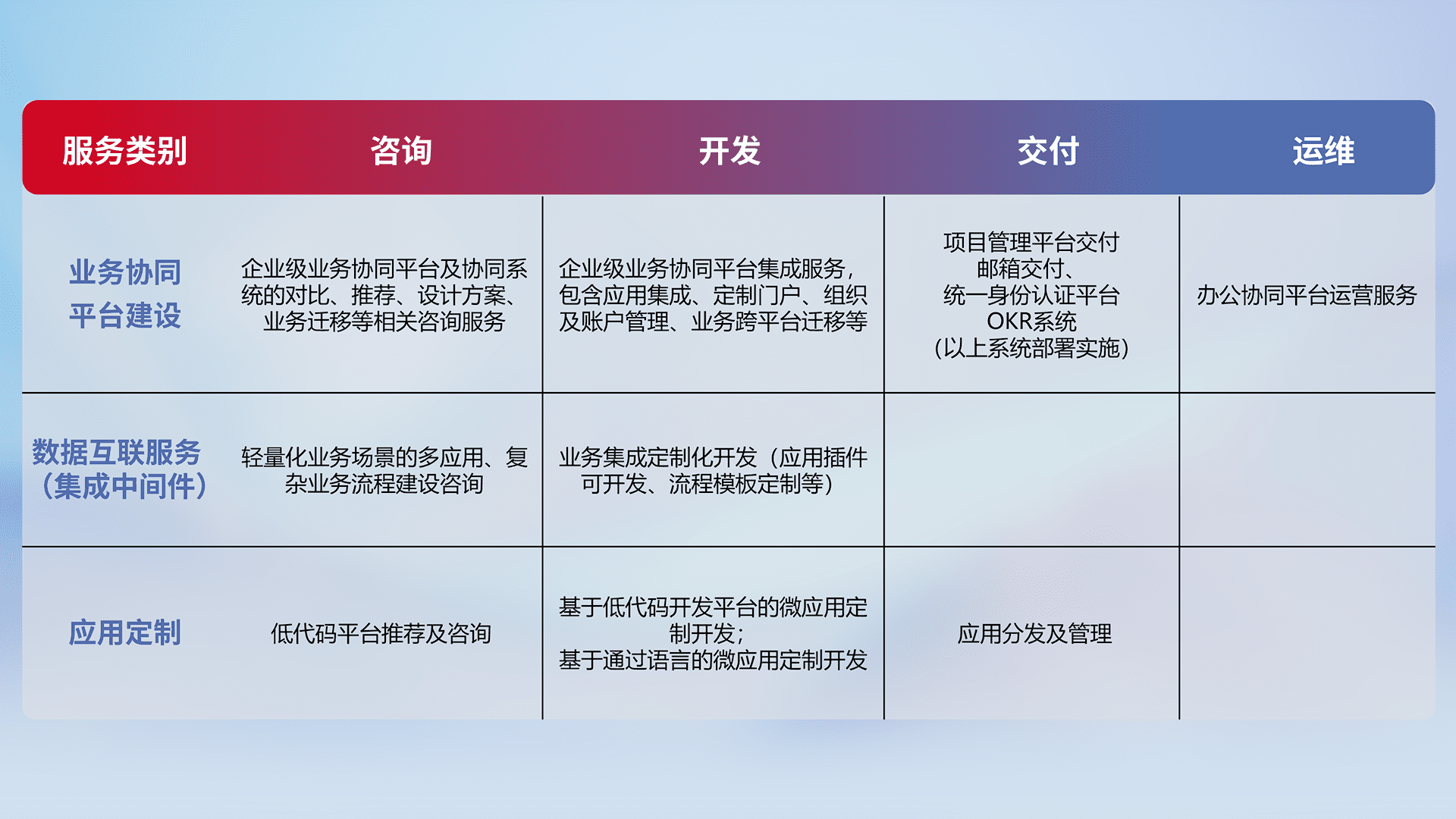 针对钉钉、、企微、、、IDaas等平台级产品提供产品的规划、、、方案、、、交付、、、定制化开发等服务,,实现如统一协同办公、、、、智能客户服务、、混合会议管理、、智能数据查询、、、等业务场景,,,,实现数字化转型。。。。